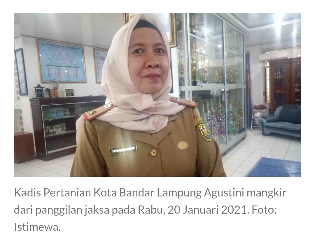 Diketahui, Kadis Pertanian untuk Kota Bandar Lampung diemban oleh Agustini. Hingga kabar ini dipublikasikan, Agustini belum merespons panggilan telepon ke nomor pribadinya.