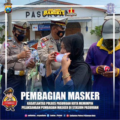 SENIN 1/2/2021 sekitaran pukul 19.30 wib .pembagian masker gratis ini dilakukan di dua titik yaitu di depan stasiun kota Pasuruan dan juga pasar besar .