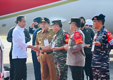 Gubernur Lampung Arinal Djunaidi dan jajaran Forkopimda Provinsi Lampung menyambut kedatangan Presiden Republik Indonesia (RI) Ir. Joko Widodo di Bandara Raden Inten II Bandar Lampung, Jum’at (05/05/2023).