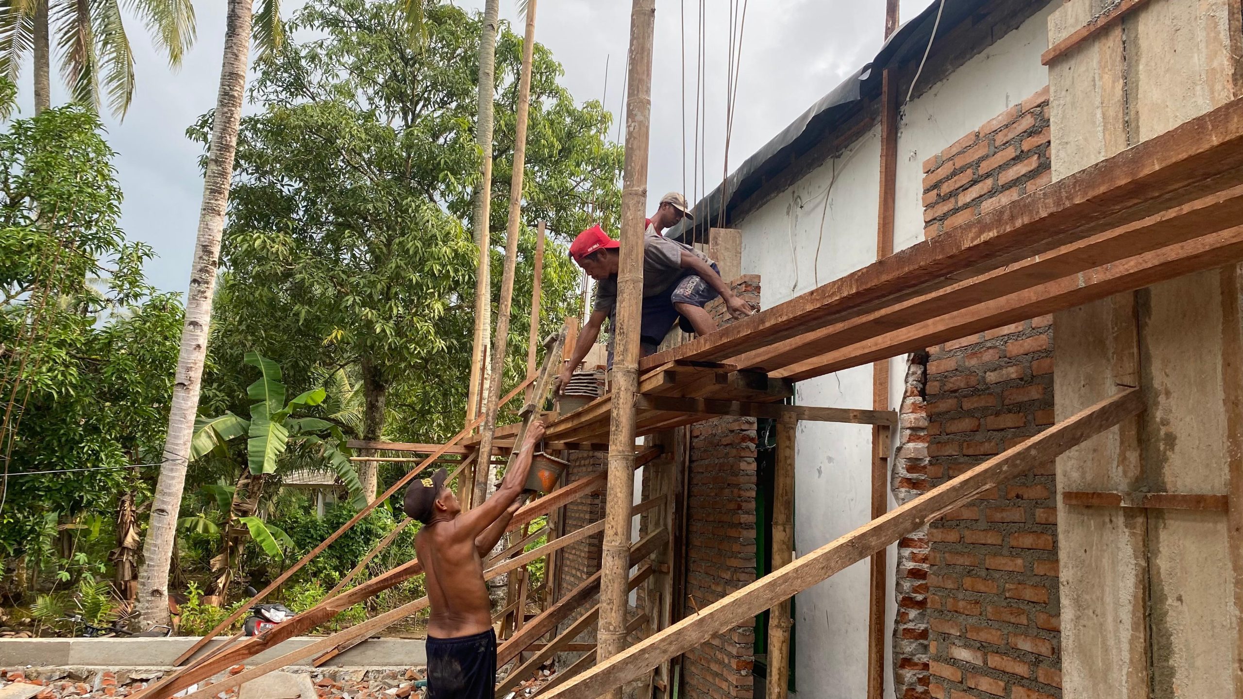 Pekerjaan pembangunan dilakukan secara gotong royong oleh personel TNI bersama warga setempat, mencerminkan semangat kebersamaan dan kemanunggalan TNI dengan rakyat.