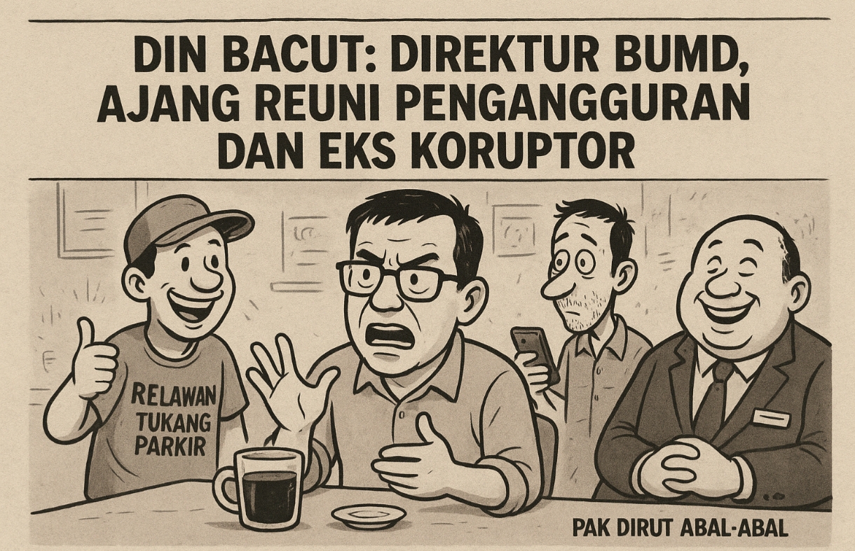 “Dengar kabar terbaru?” seru Din Bacut. “Kursi direktur BUMD sekarang jadi rebutan macam lomba balap karung. Yang daftar bukan cuma pengangguran modal relawan, tapi juga wajah-wajah lama yang pernah bikin BUMD hampir bangkrut.”