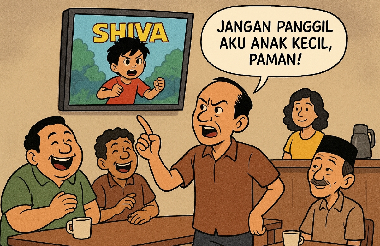 “Jangan panggil aku anak kecil, paman!” katanya tiba-tiba dengan suara lantang, menirukan kartun Shiva di ANTV.