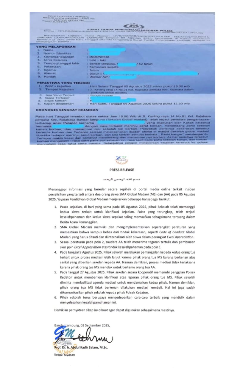4. Koordinasi dengan Kepolisian: Sekolah telah memenuhi panggilan dari Polsek Kedaton pada 27 Agustus 2025 untuk memberikan klarifikasi dan diminta memfasilitasi mediasi. Namun, upaya tersebut kembali ditolak oleh orang tua korban.