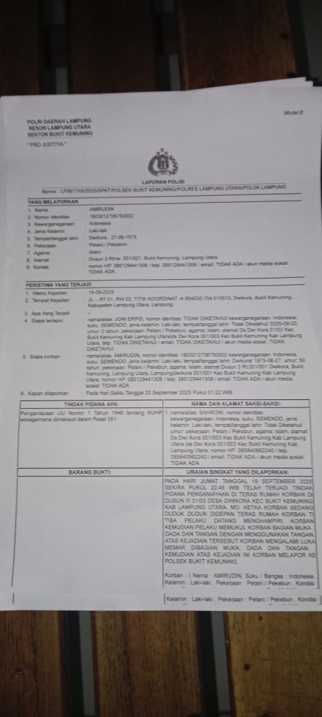 Laporan itu tertuang dalam surat Nomor : LP/B/77/IX/2025/SPKT/POLSEK BUKIT KEMUNING/POLRES LAMPUNG UTARA/POLDA LAMPUNG.