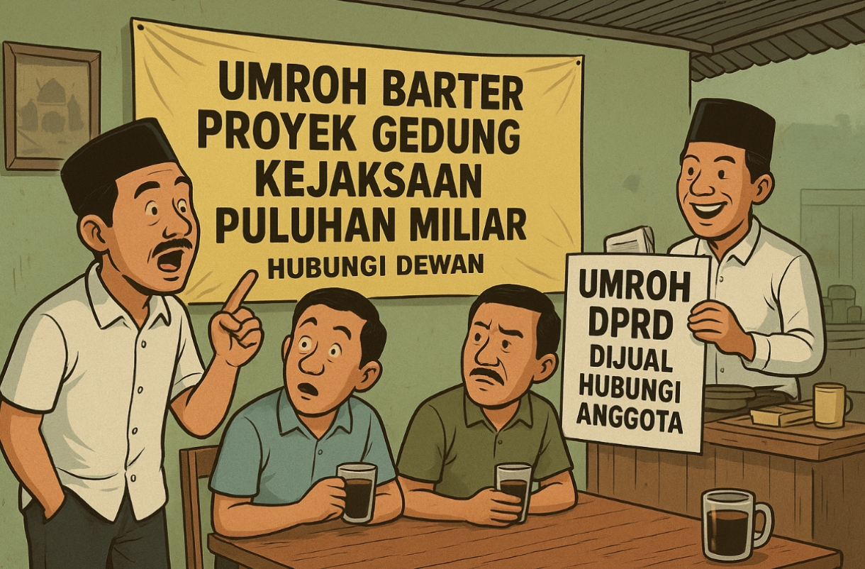 “Calo surga! Hahaha, bener banget! Pantesan anggaran gedung Kejaksaan gampang lolos. Wong barterannya bukan akal sehat, tapi tiket umroh!”
