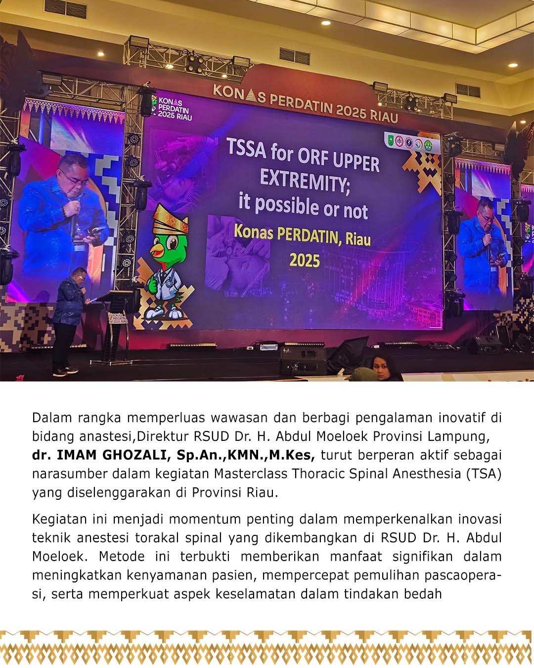 Dalam rangka memperluas wawasan dan berbagi pengalaman inovatif di bidang anastesi, Direktur RSUD Dr. H. Abdul Moeloek Provinsi Lampung, dr. IMAM GHOZALI, Sp.An.,KMN.,M.Kes, turut berperan aktif sebagai narasumber dalam kegiatan Masterclass Thoracic Spinal Anesthesia (TSA) yang diselenggarakan di Provinsi Riau.