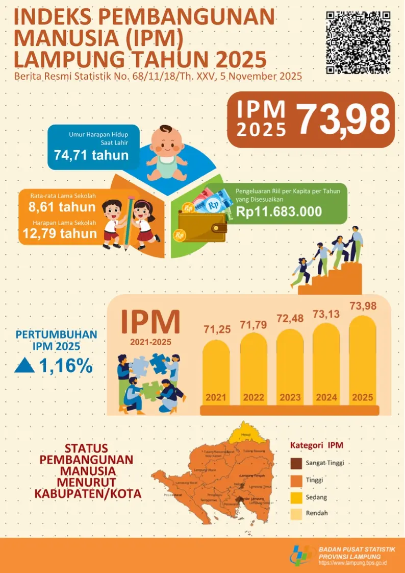 BANDARLAMPUNG — Badan Pusat Statistik (BPS) Provinsi Lampung mencatat Indeks Pembangunan Manusia (IPM) tahun 2025 mencapai 73,98, naik 0,24 poin dibandingkan tahun sebelumnya yang sebesar 73,74. Kenaikan ini menandai perbaikan berkelanjutan dalam mutu hidup masyarakat di tiga dimensi utama: pendidikan, kesehatan, dan daya beli.