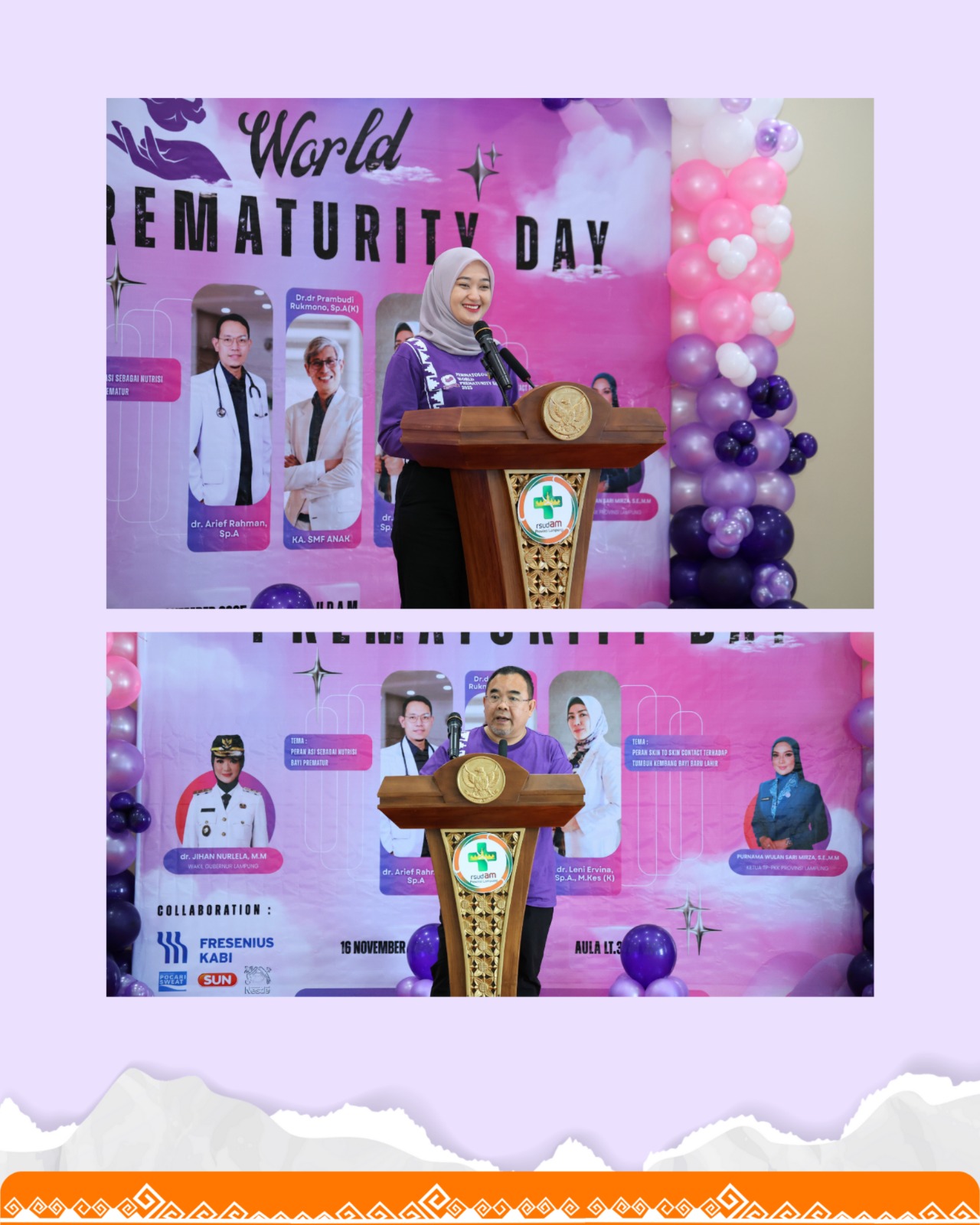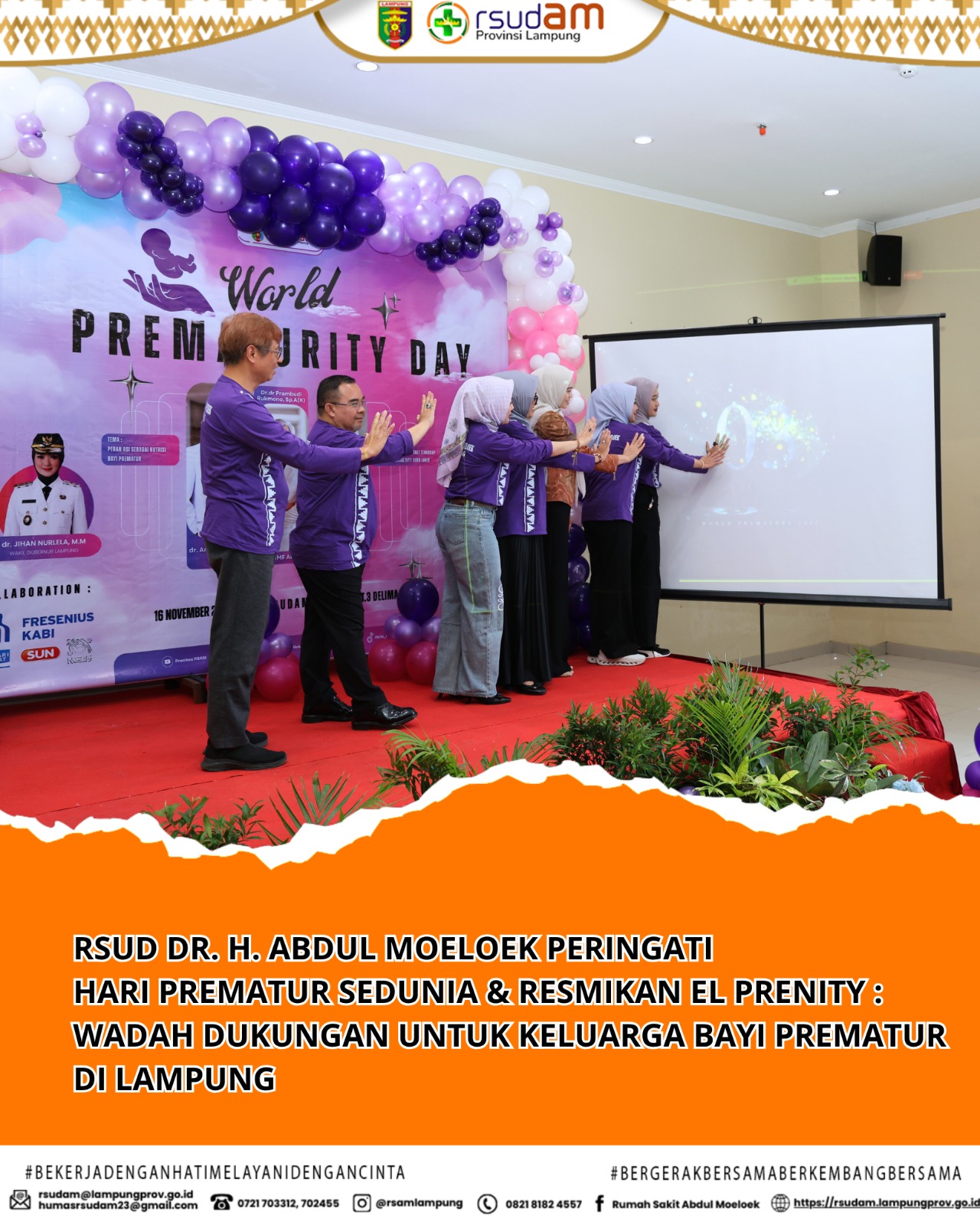 RSUD Dr. H. Abdul Moeloek Provinsi Lampung menyelenggarakan peringatan Hari Prematur Sedunia yang dirangkaikan dengan peresmian inovasi layanan terbaru bernama El Prenity pada 16 November 2025 bertempat di Aula Delima RSUD Dr. H. Abdul Moeloek. Acara ini dihadiri oleh Ibu Gubernur, Wakil Gubernur , Ketua TP PKK Prov Lampung , Direksi & jajaran manajemen RSUDAM,Pasien & Perwakilan Keluarga.
