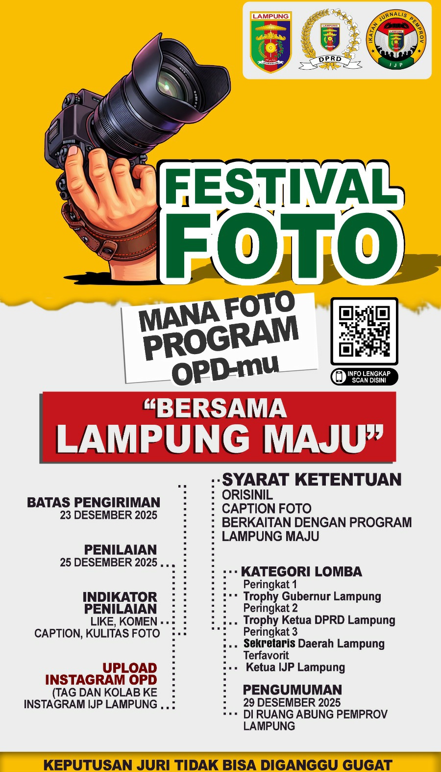 Festival Foto “Bersama Lampung Maju” menjadi salah satu langkah IJP dalam mendukung publikasi pembangunan berkelanjutan dan memperkuat branding Provinsi Lampung sebagai daerah yang terus berinovasi, maju, dan berdaya saing.