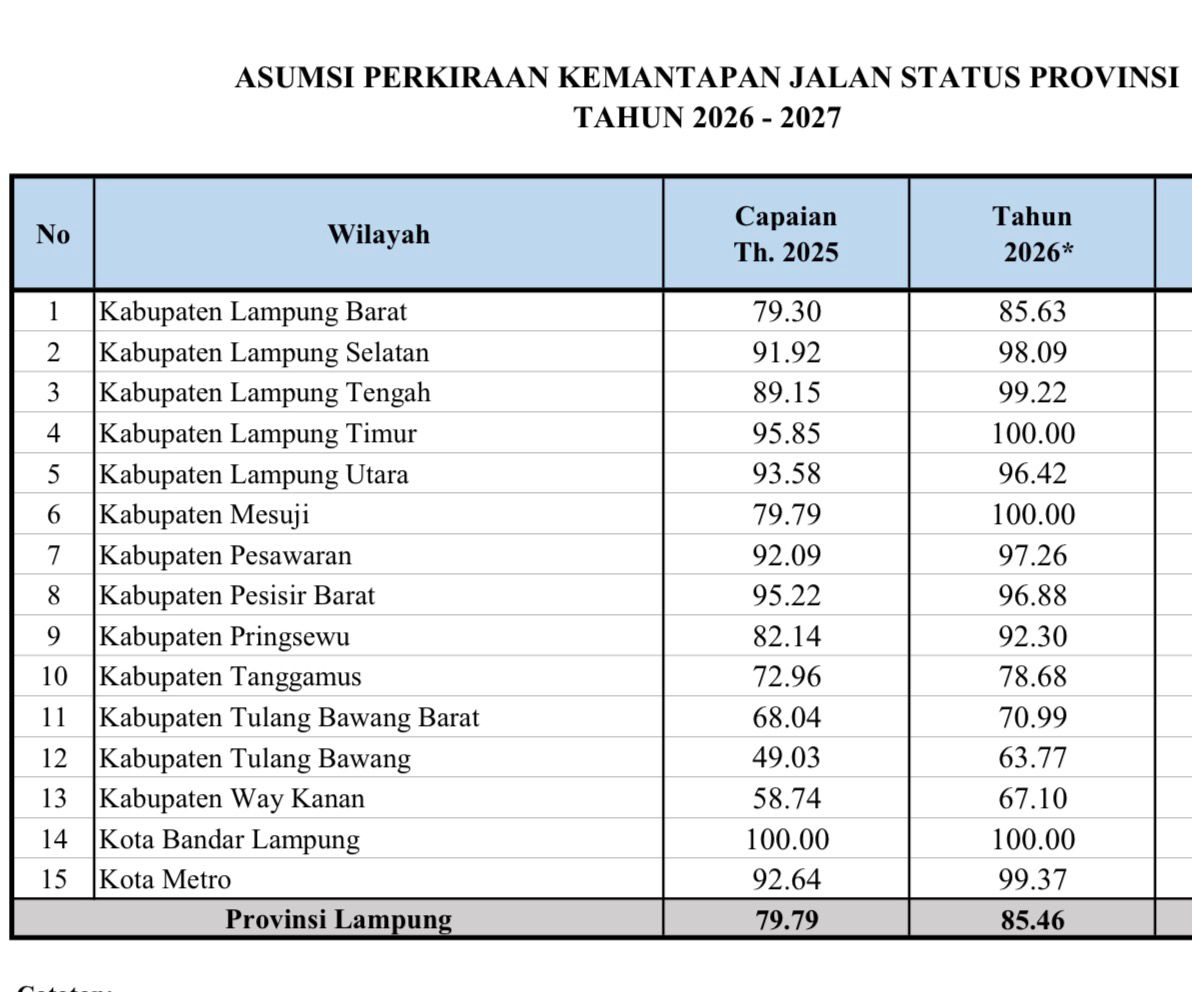 Bandar Lampung — Pemerintah Provinsi Lampung mempercepat pembangunan infrastruktur dengan fokus utama pada jalan berstatus provinsi yang tersebar di wilayah kabupaten. Data terbaru tahun 2026 menunjukkan bahwa peningkatan kemantapan jalan tidak hanya terjadi di perkotaan, tetapi justru didorong oleh panjang dan dominasi ruas jalan provinsi yang berada di kabupaten.
